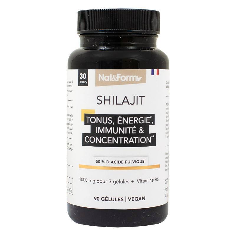 Extrait de shilajit (Asphaltum punjabianum), chlorhydrate de pyridoxine (vitamine B6). Gélule d'origine végétale (HPMC).