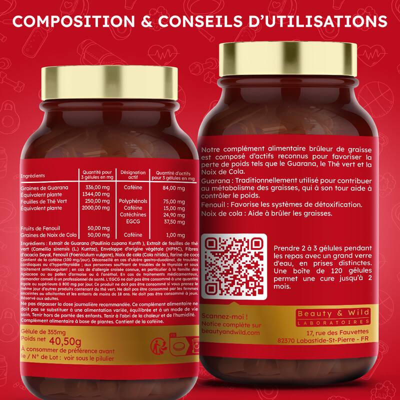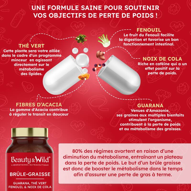 Brûle-graisse associe des extraits de guarana, thé vert, noix de cola, fenouil et fibres d'acacia aux propriétés complémentaires. Grâce à leur richesse en caféine, polyphénols et catéchines, ces actifs stimulent le métabolisme, favorisent la combustion des graisses et soutiennent la digestion pour une gestion du poids optimisée.