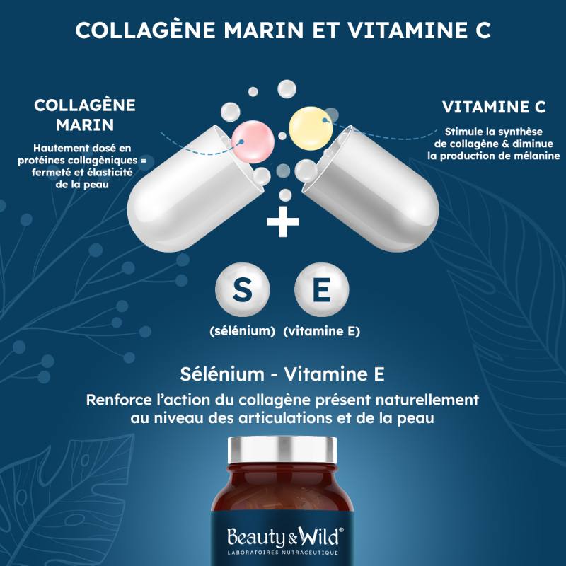 Collagène marin Naticol® (poisson), vitamine C, vitamine E, antiagglomérant: sels de magnésium d'acides gras, levure enrichie en sélénium, antiagglomérant : dioxyde de silicium. Gélules d'origine végétale (HPMC).
