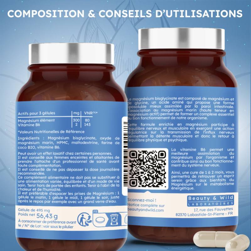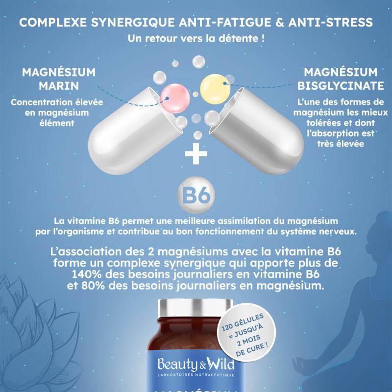 L'association de 2 magnésiums - Bisglycinate (haute absorption) et Magnésium Marin (haute teneur) et de la vitamine B6 forment un complexe synergique qui apporte plus de 140% des besoins journaliers en vitamine B6 et 80% des besoins journaliers en magnésium.