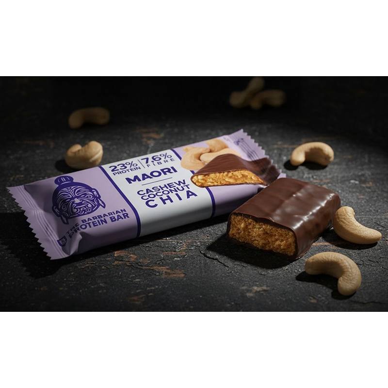 Barre protéinée bio, végane et sans gluten fourrée aux noix de cajou, à la noix de coco et aux graines de chia, enrobée de chocolat noir de qualité supérieure.